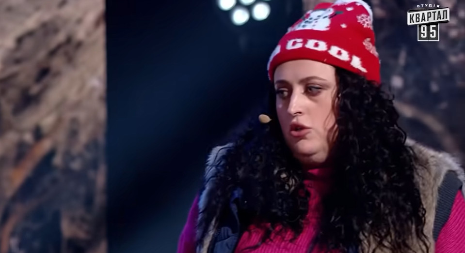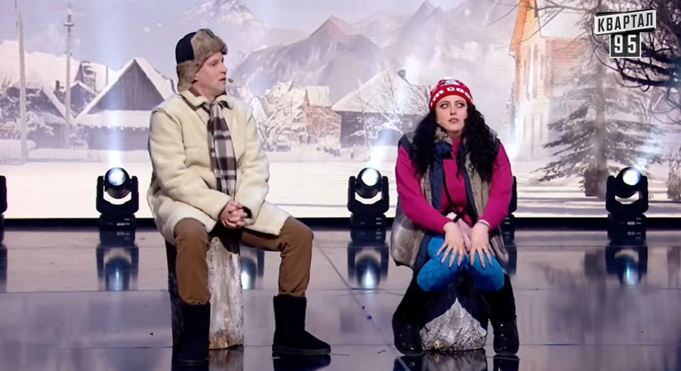 У новорічному випуску студія "Квартал 95" показала номер про переселенку зі Скадовська – тимчасово окупованого міста Херсонської області. У ньому актриса Ірина Гатун грає жінку, яка намагається розмовляти українською мовою із мешканцем Закарпаття у виконанні Юрія Великого.