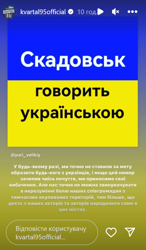 На тлі обурення "Квартал 95" виправдався за образливий номер. Для цього студія використала коментар коміка Юрія Великого, який зіграв закарпатця. За його словами, Скадовськ для номера обрали виключно заради каламбуру "я сі Ськадовська".