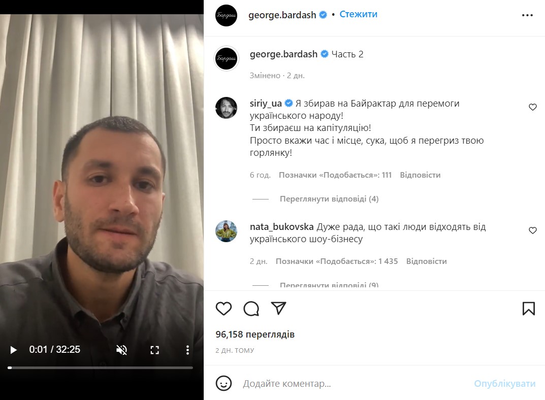 Нагадаємо, днями Бардаш вийшов у прямий ефір Instagram, де вперше відкрито озвучив свою позицію щодо війни в нашій країні. Так, він заявив, що Росія – "величезна територія з ресурсами та великою культурою, а потенціал цієї країни не зрівняється з жодною країною у світі".