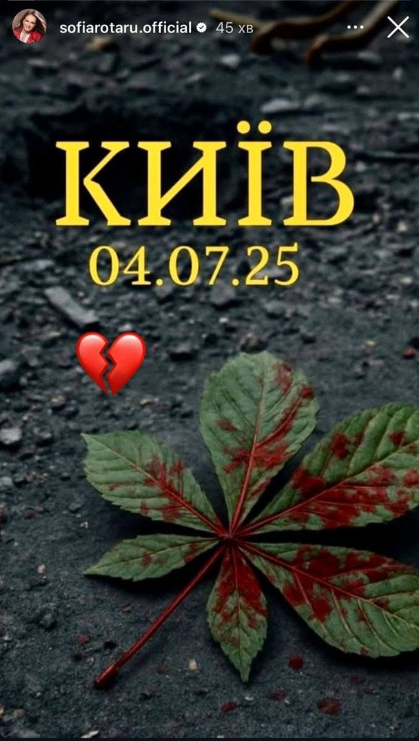 Софія Ротару зазвичай не оминає увагою злочини терористичної РФ та висловлює свою позицію. Цього разу артистка була лаконічною, але водночас промовистою. Листок каштана в крові, дата обстрілу та розбите серце.