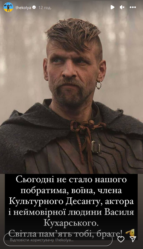 "Сьогодні не стало нашого побратима, воїна, члена Культурного Десанта, актора та неймовірної людини Василя Кухарського. Світла пам'ять тобі, брате", - написав засновник Культурного Десанту.