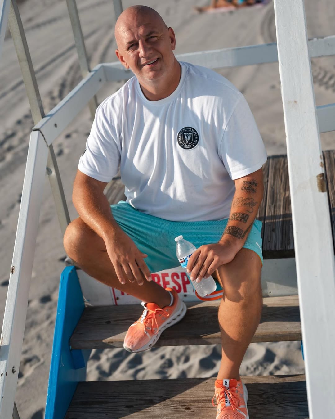 Шоумен також показав пляжний знімок. Чоловік сфотографувався, сидячи на сходах. Потап був одягнений у білу футболку, шорти бірюзового кольору та помаранчеві кросівки.