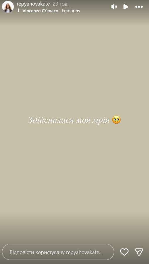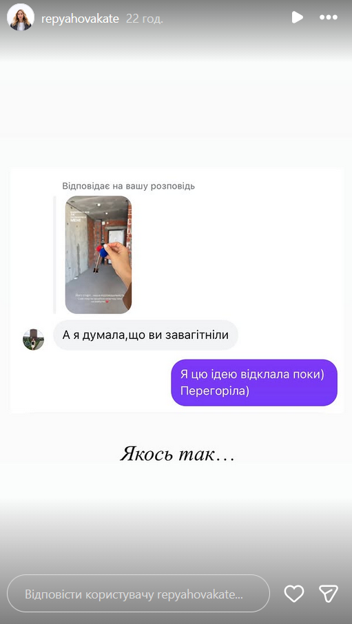 Після короткого повідомлення про здійснення мрії дехто вирішив, що йдеться про омріяну вагітність. Утім Репяхова не лише заперечила ці здогадки, а й зізналася, що відклала цю тему, бо "перегоріла".