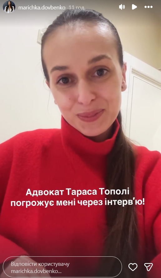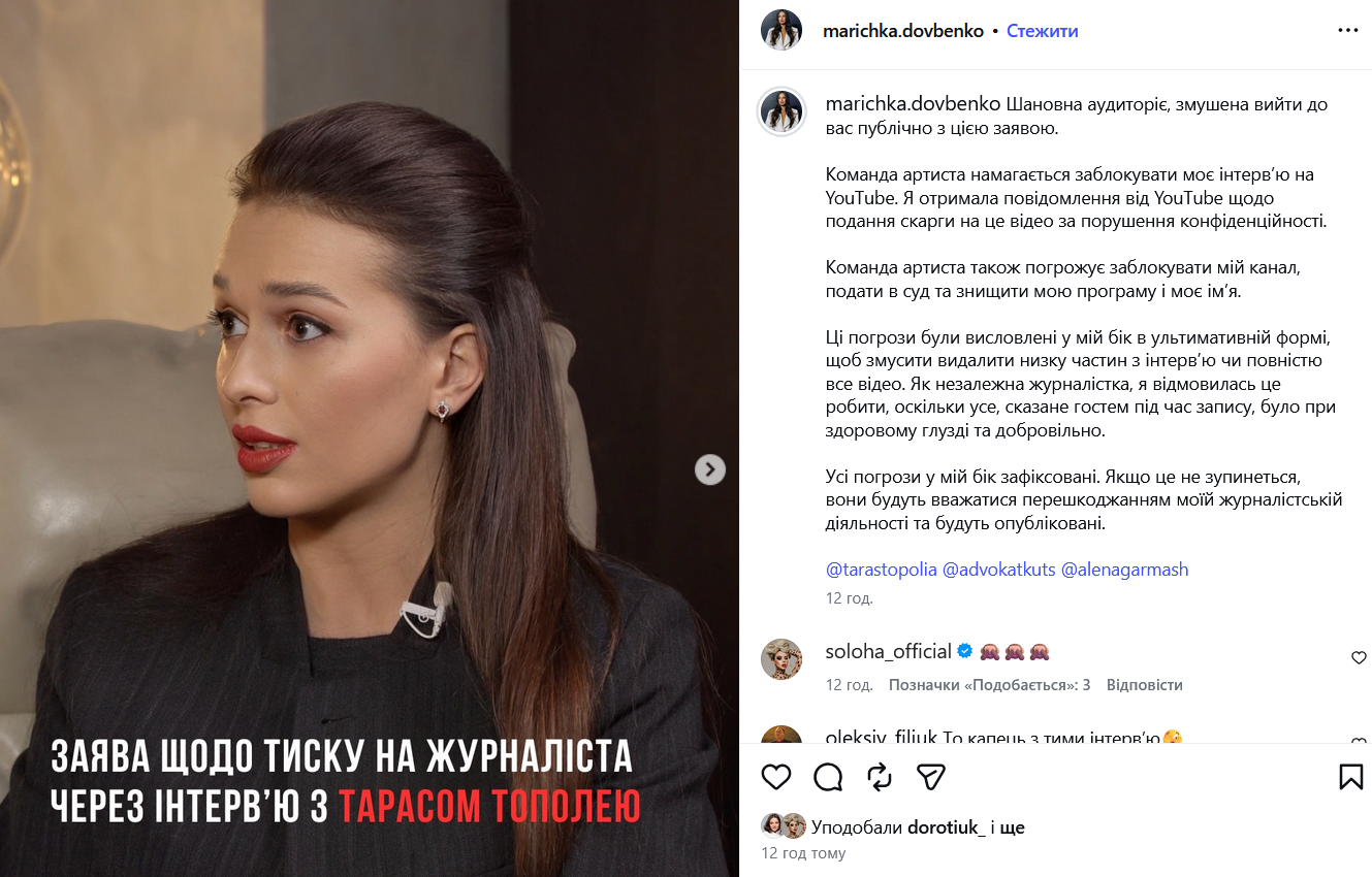 Журналістка Марічка Довбенко заявила, що команда Тараса Тополі тисне на неї через інтерв'ю з артистом. За її словами, представники музиканта нібито вимагають внести зміни або повністю видалити відео, яке опубліковане на її YouTube-каналі, проте вона відмовилася.