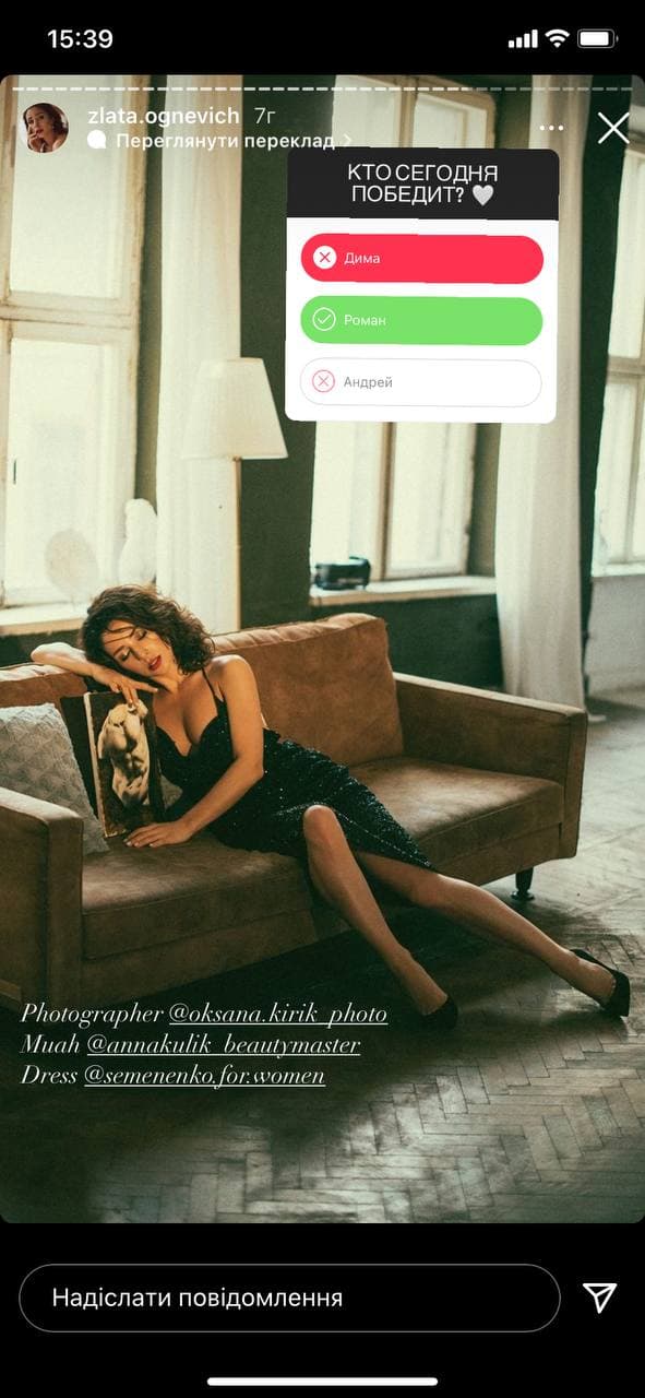 Співачка запропонувала дописувачам свого Instagram вгадати, хто виграє у фіналі. Вона опублікувала в "сторіз" опитування та вказала три варіанти відповіді: Діма, Роман та Андрій. При цьому ім'я психолога вказала як правильний варіант.