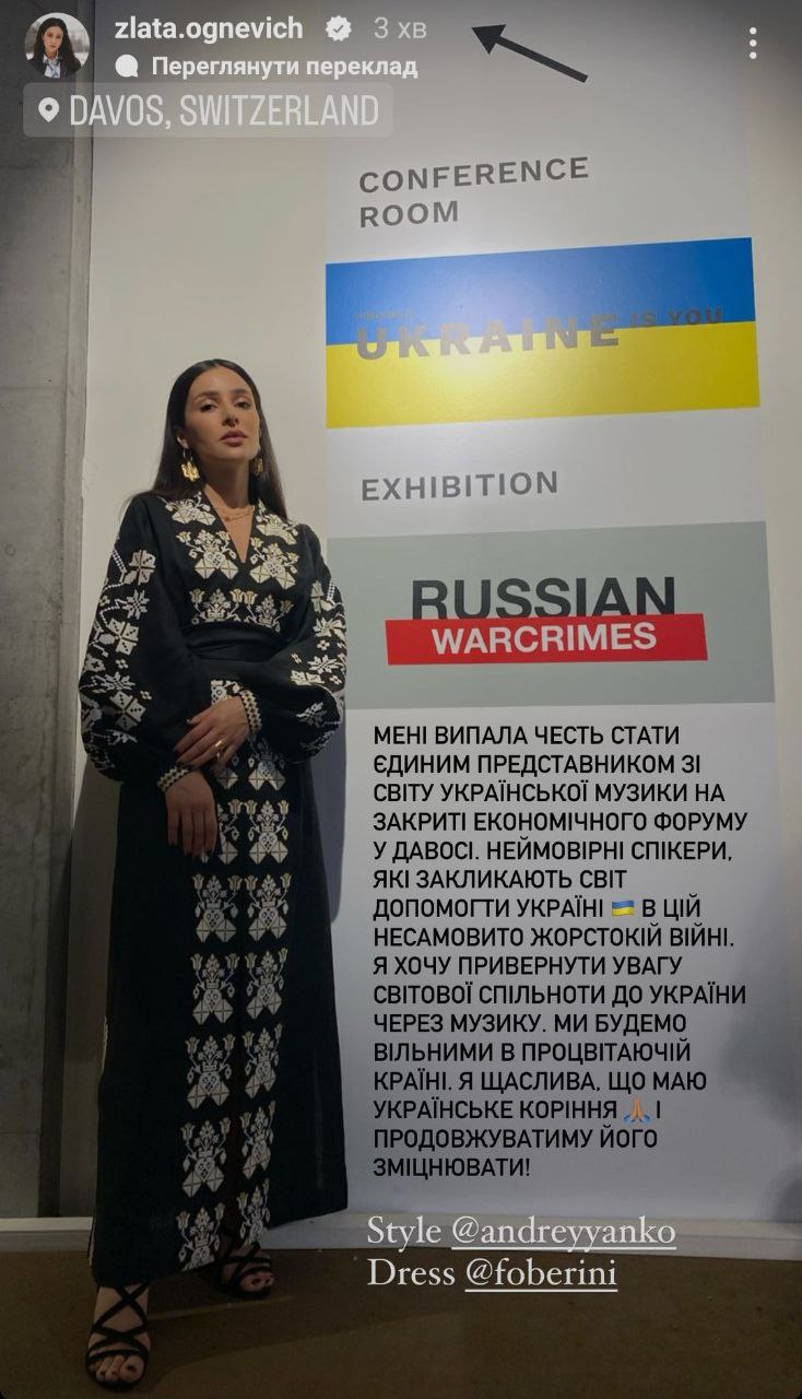 Окрім представників політикуму форум також відвідали українські артисти – хоч і з іншим завданням. Раніше Святослав Вакарчук показав фото із гітарою та розповів, що виконав у Давосі кілька пісень про те, як українці захищають свободу. Тепер про свою участь у престижному заході повідомила Злата Огнєвіч. Співачка опублікувала в Instagram-історіях кілька знімків із Давосу та поділилася емоціями.