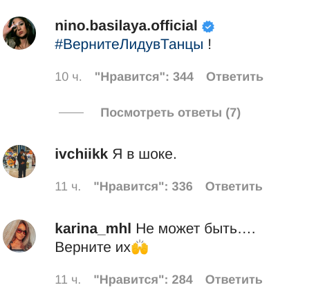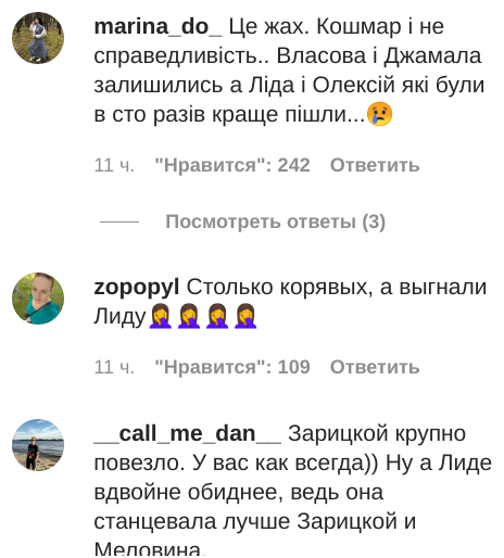 "Як тепер вірити в справедливість цього проекту?" "Злив. Ліда була однією з найсильніших учасниць", - пишуть у коментарях. - "Вони треті в таблиці. Вони мали бути в фіналі, це просто не чесно". "Одна з найсильніших пар. У мене шок".