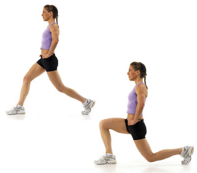 Далі робимо випади. Руки повинні бути на талії, спина рівна. По черзі робіть на кожну ногу широкий крок вперед, згинаючи переднє коліно під кутом 90 градусів. Задня нога повинна упиратися носочком у підлогу. Повторювати випади потрібно також в 3 підходи. Кількість повторень ви можете вибрати на свій розсуд, проте вона не повинна бути менше, ніж 12 випадів за 1 підхід на кожну ногу.