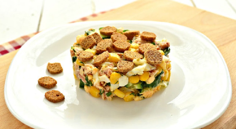 Інгредієнти: консервована горбуша (150 г), сухарики (40 г), яйце (1 шт.), свіжий огірок (1 шт.), консервована кукурудза (150 г), оливкова олія (1-2 ст. л.), кріп, зелена цибуля, сіль, перець.