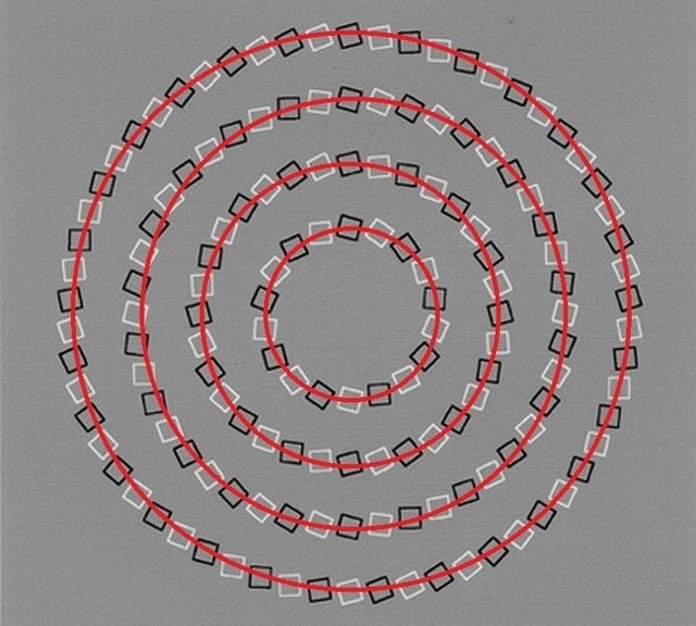 На геометричній ілюзії нижче багато глядачів бачать, як кола з дрібних квадратиків перетинаються одне з одним. Однак, насправді це неправда. Жодне з кіл не торкається свого сусіда і, тим більше, не перетинає його.