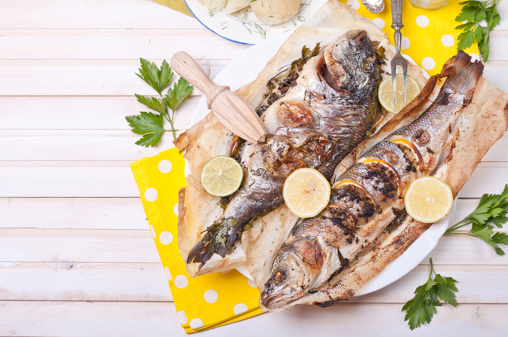 Продукти: сібас (2 шт.), лимон (1 шт.), розмарин і чебрець (пучок), суміш мелених перців (за смаком), морська сіль і сушені трави (за смаком). Рибу потрібно помити, почистити і випатрати, потім промити ще раз і обсушити паперовим рушником. Натерти рибу всередині і зовні сумішшю солі, перцю та інших приправ. Покласти всередину кожної рибини шматочки лимона і кілька гілочок розмарину і чебрецю. Потім перекласти рибу на застелене пергаментом деко і відправити в духовку на 30-40 хвилин при температурі 180 градусів. За 15 хвилин до готовності трохи скропити рибу зверху лимонним соком.