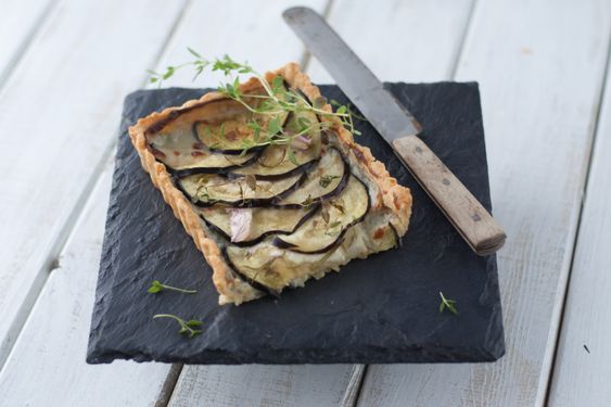 Для приготування пирога з баклажанами візьміть: 150 г борошна, 100 г вершкового масла, 2 ст.л. води, 200 г баклажанів, 150 г вершків, 100 г твердого сиру, 1 яйце, базилік сушений, зелень петрушки, оливкову олію.