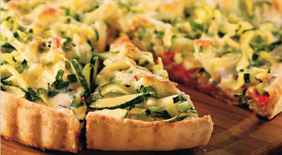 Розкатайте листкове тісто і помістіть його у форму для випікання. В окремій ємності збийте сметану та яйця, додайте молоко, натертий сир та нарізану шинку. Половину заливки вилийте у форму. Зверху викладіть тонко нарізані кабачки. Додайте другу частину заливки. Зверху також викладіть кабачки. Запікайте при 180 градусах у режимі верхнього та нижнього нагріву 40 хвилин.