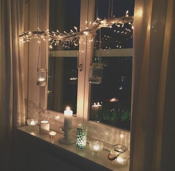 Особливу атмосферу свята створять свічки на вікнах. Так, ви можете прикрасити підвіконня композицією з декількох маленьких свічок і однією великою або ж підвісити кілька свічок в мініатюрних баночках.