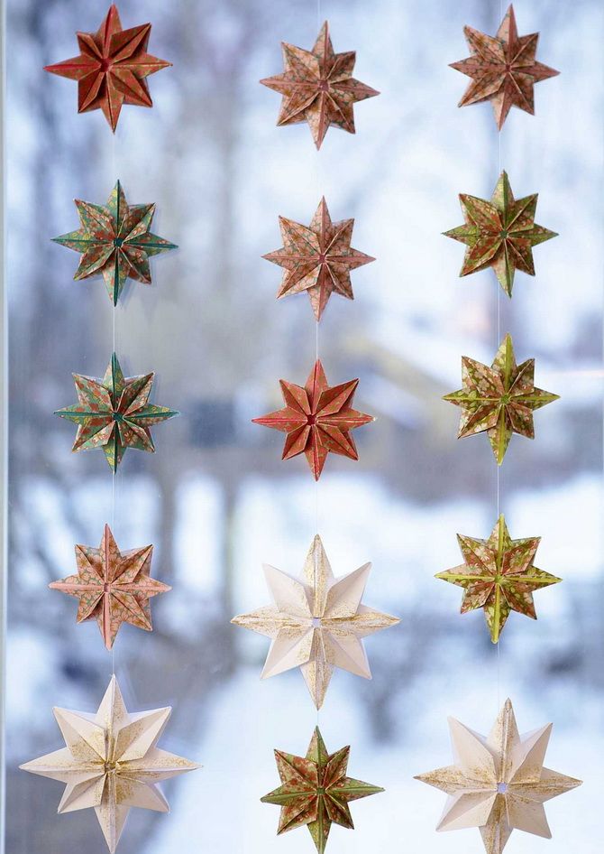 Якщо ви не хочете псувати скло клеєм, то можете зробити об'ємні витинанки у вигляді сніжинок, ялинок або зірочок, скріпити їх у своєрідну гірлянду і підвісити на вікна, двері, стіни вашого будинку або ж просто розкидати по підвіконню.