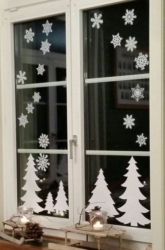 Ще один варіант декору для вікон на новий рік 2021 - зробити витинанки. Це силуетні фігурки з паперових або картонних листів, з яких можна зробити найрізноманітніші картини. На сьогоднішній день в інтернеті існує чимало заготовок витинанок, які можна роздрукувати на принтері, а потім вирізати. Отримані сніжинки приклейте на вікна за допомогою клею або двостороннього скотча.
