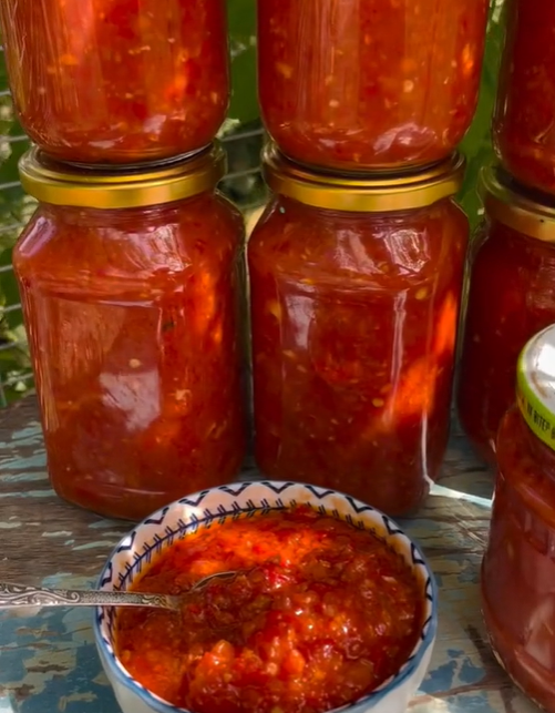 Аджика за цим рецептом - кисло-солодка, гостренька і в міру пекуча, з неповторним смаком хрону. Для її приготування потрібно 2 кг стиглих помідорів і 1 кг болгарського перцю. Кількість гострого перцю авторка радить регулювати на свій смак, оскільки перчики бувають різної гостроти.