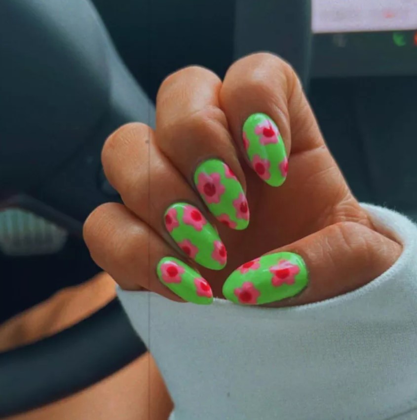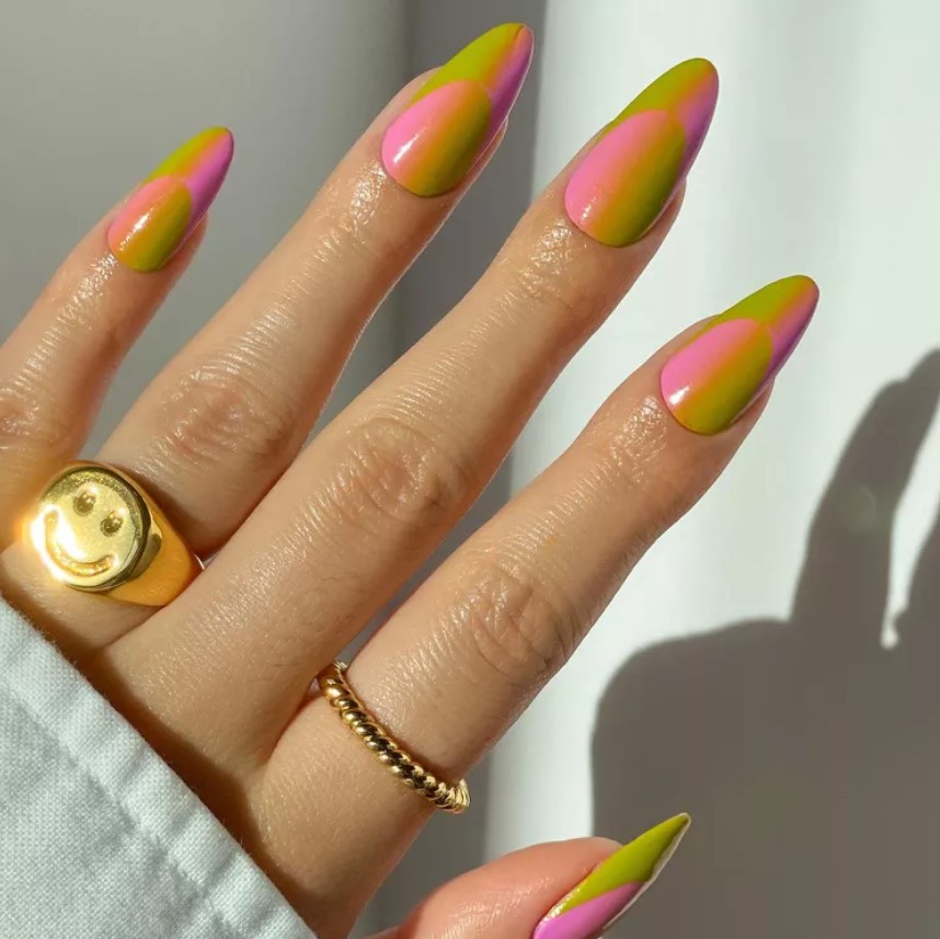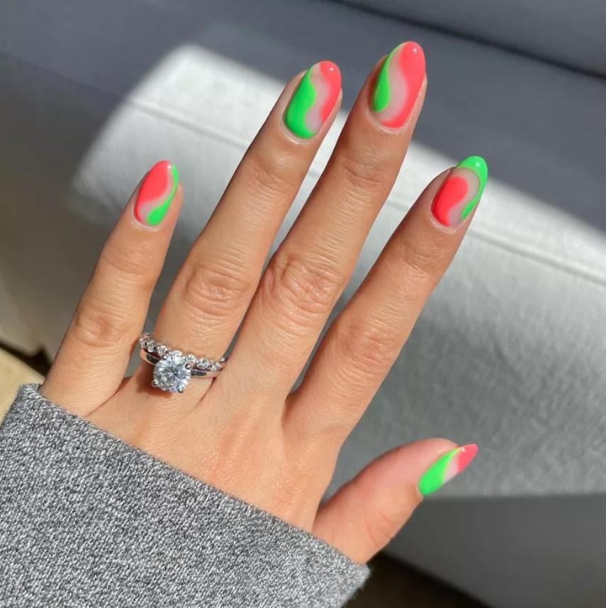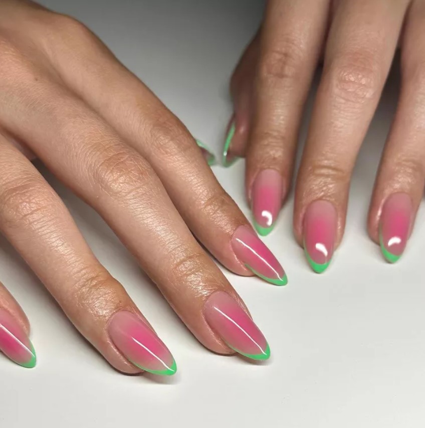 Якщо бажаєте справжніх літніх поєднань, зверніть увагу на наступний варіант трендового покриття. Оберіть кислотні відтінки зеленого та рожевого та поєднайте їх у тій формі та дизайні, які вам до вподоби.