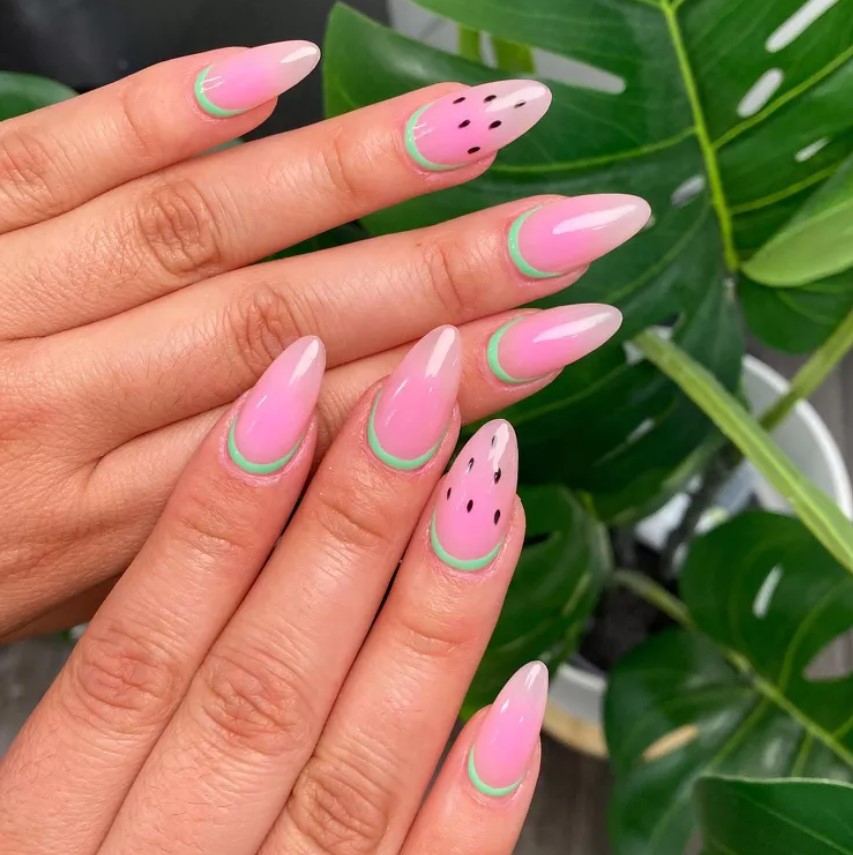 Для створення такого покриття оберіть насичену рожеву чи червоно-рожеву основу, а у зоні кутикули додайте тонкі зелені лінії, які будуть нагадувати ту саму скибочку. Такий дизайн виглядатиме неординарно і точно приверне увагу.
