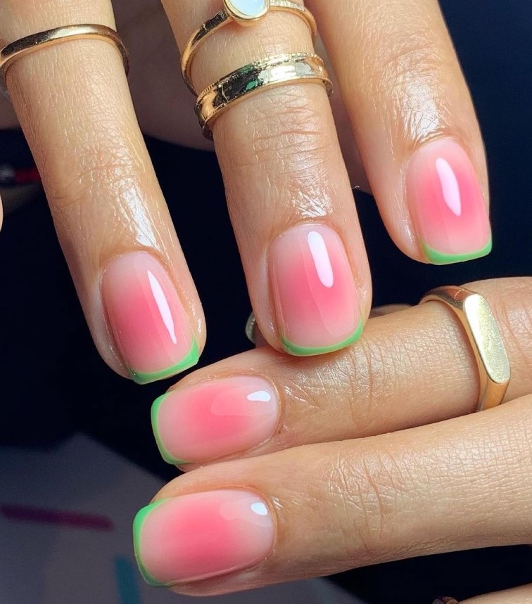 У цьому випадку все навпаки: оберіть ніжну основу, а кінчик зробіть насиченим зеленим чи м'ятним кольором, створивши таким чином покриття у відтінках кавуна. Найкраще такий манікюр виглядатиме на овальній або мигдальній формі.