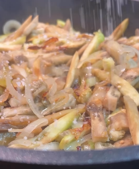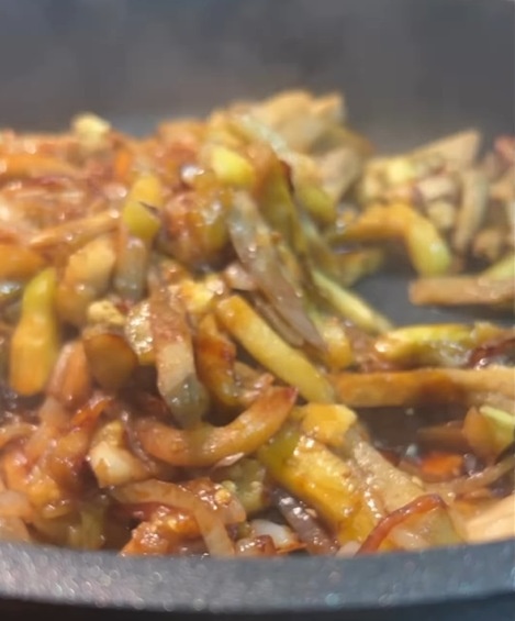 "Важливо не смажити на великому вогні - тільки на середньому. І дуже важливо накрити кришкою саме після додавання баклажанів в пательню. А останній етап - коли додаємо сіль і соус - обов"язково без кришки!!! Бо якщо баклажани почнуть розлітатись, буде менше грибного смаку", - наголосила Дарія.