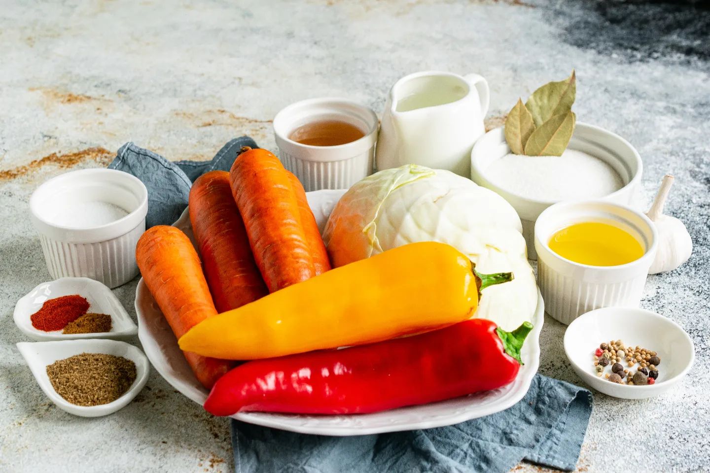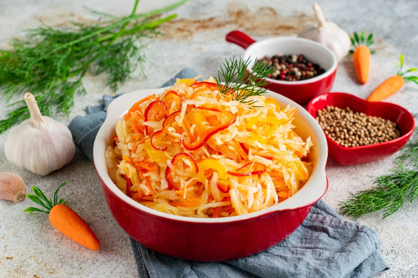 Основні інгредієнти: білокачанна капуста (2 кг), морква (4 шт.), болгарський перець (2 шт.), часник (5 зубчиків), мелений коріандр (1 ч. л.), мелений червоний перець (0,5 ч. л.), мелена паприка (0,5 ч. л.).