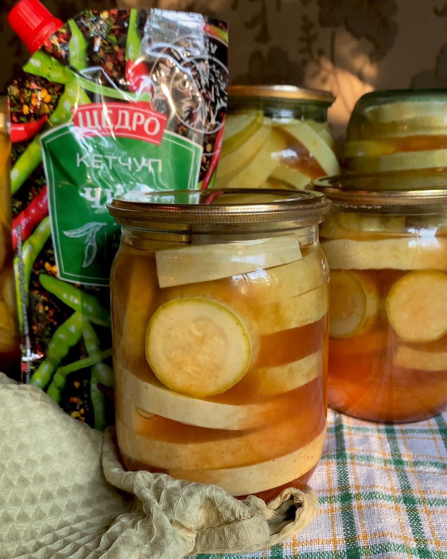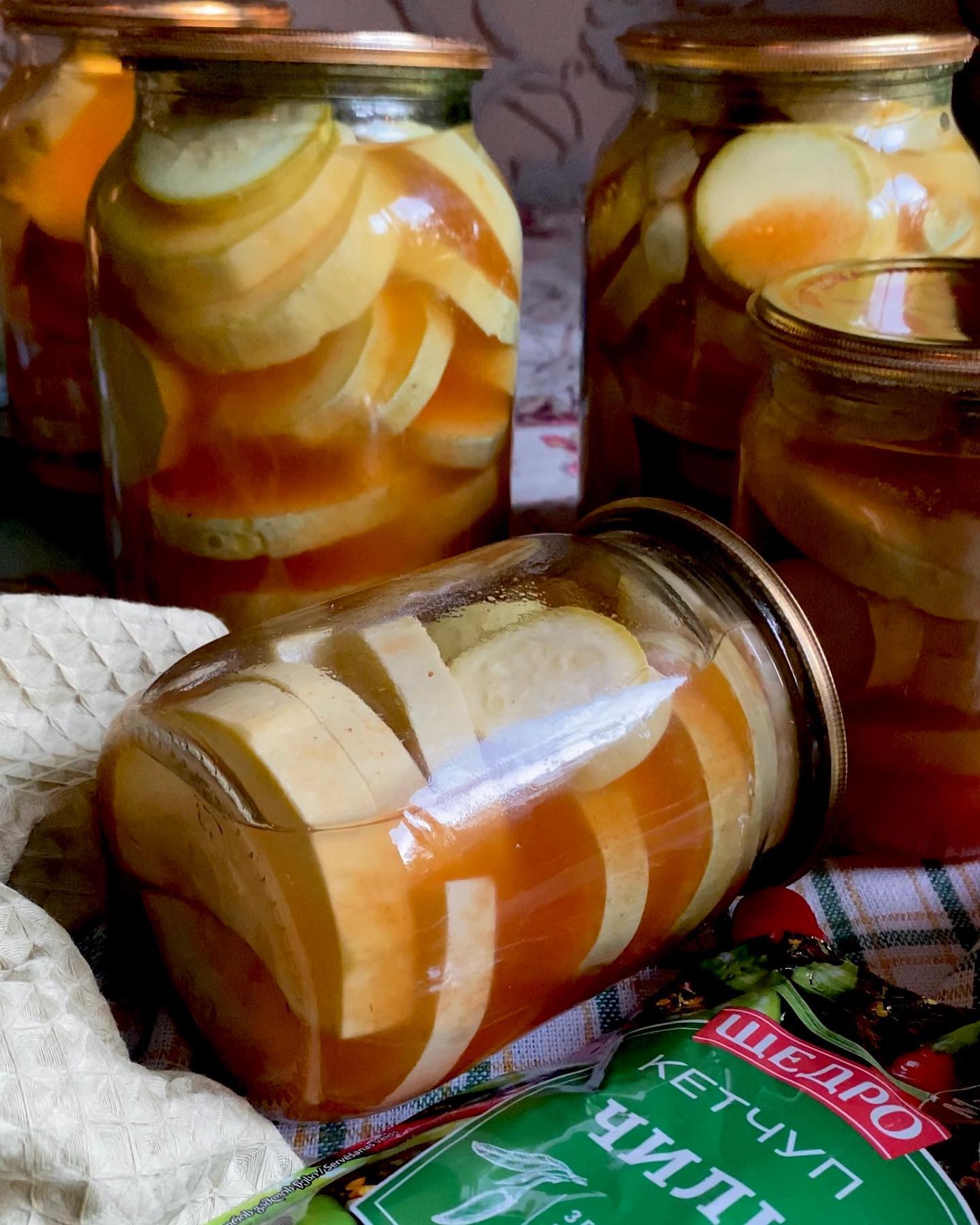 Інгредієнти: кабачок (2,5 кг), вода (1,5 л), кетчуп чилі (300 г), цукор (1 ст.), оцет (1 ст.), сіль (2 ст. л.), часник ( 8-10 зуб.), листя хрону, кріп, запашний перець (8-10 шт.), чорний перець горошком (30 шт.).