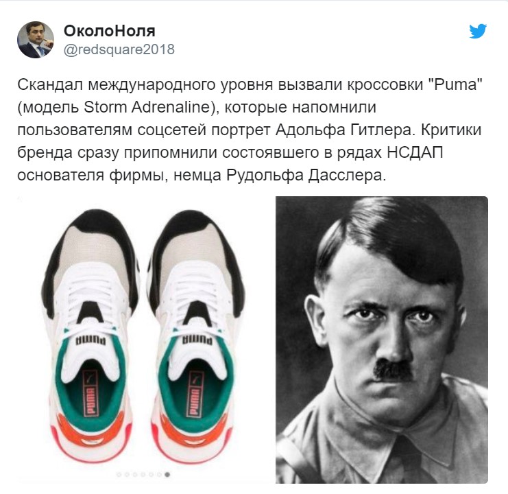 У нових кросівках Puma раптом розгледіли портрет Адольфа Гітлера. А саме його чубок і фірмові вуса. Компанію тут же звинуватили в нацизмі, але, схоже поспішили з висновками. Давайте-но придивимося. Хіба це не Микола Гоголь? Ні-ні, стривайте! Та це ж Амаяк Арутюнович Акопян!