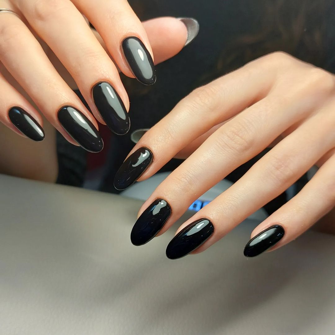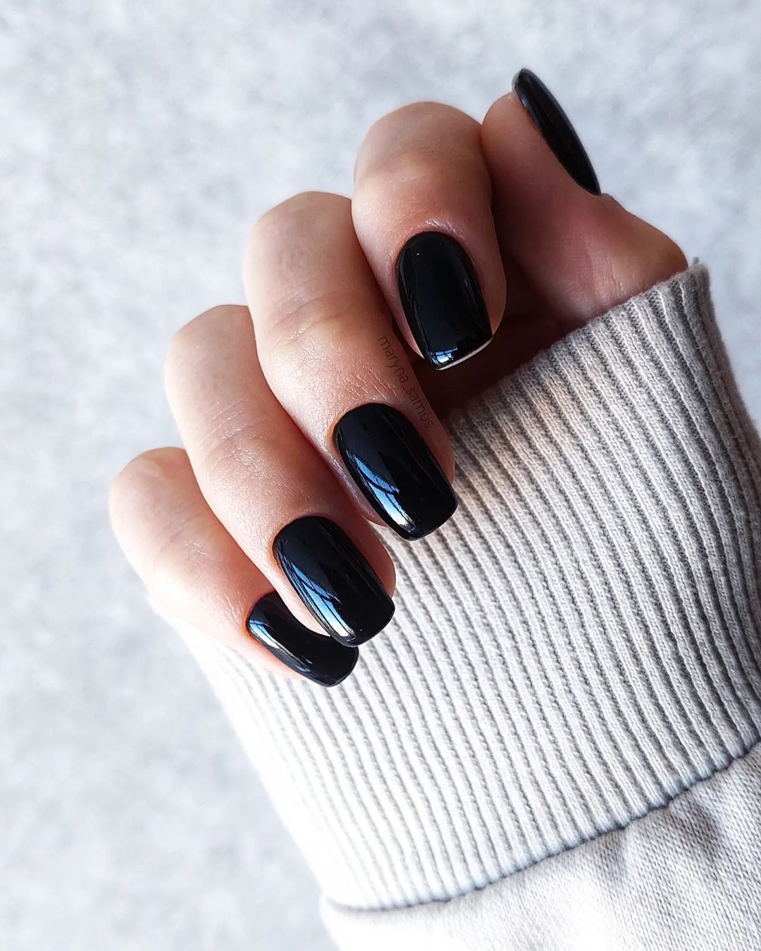 Глянцеве чорне покриття нігтів – це позачасовий та елегантний вибір. Такий манікюр підходить як для повсякденного, так і для формального приводу, доповнює широкий спектр образів.