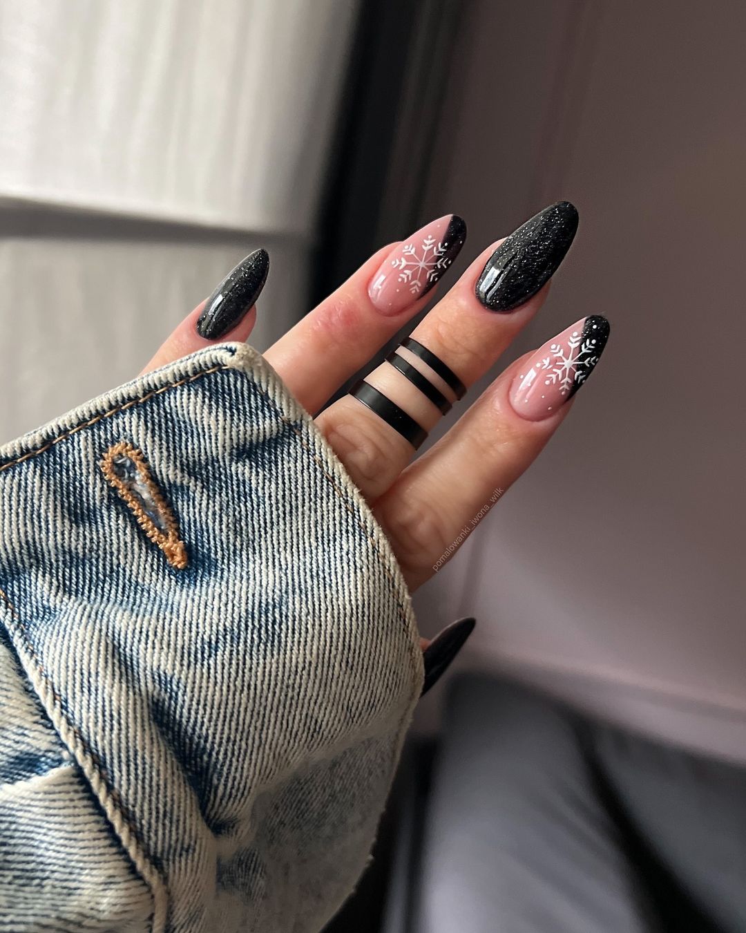 Поки зима у розпалі, ви можете сміливо доповнювати свій манікюр блискітками та візерунками у вигляді сніжинок. Такий дизайн виглядає стильно і водночас час грайливо.