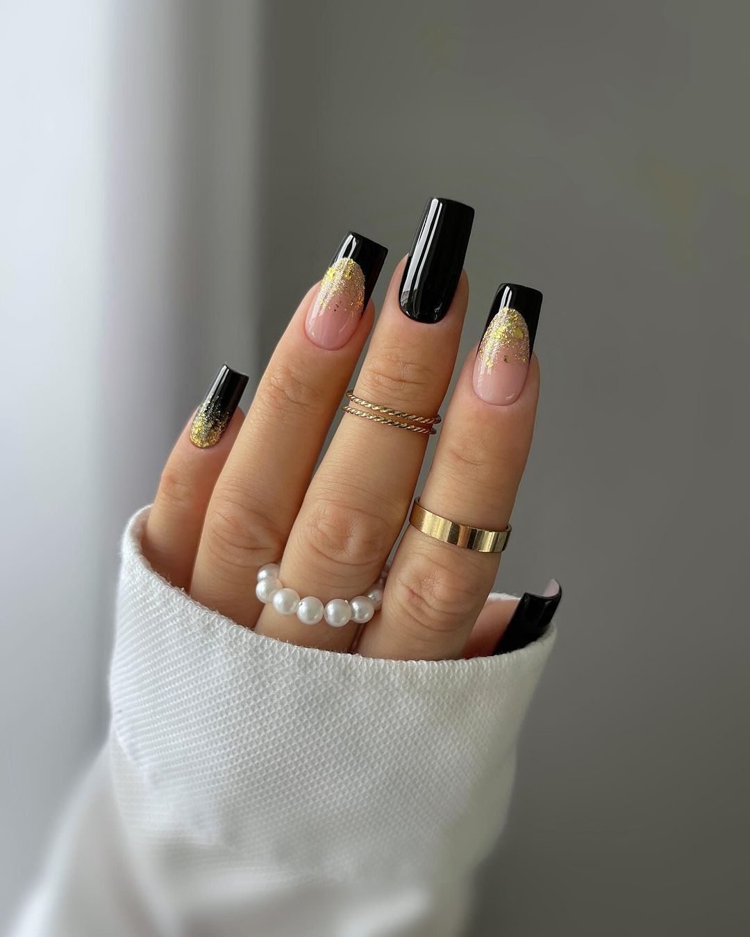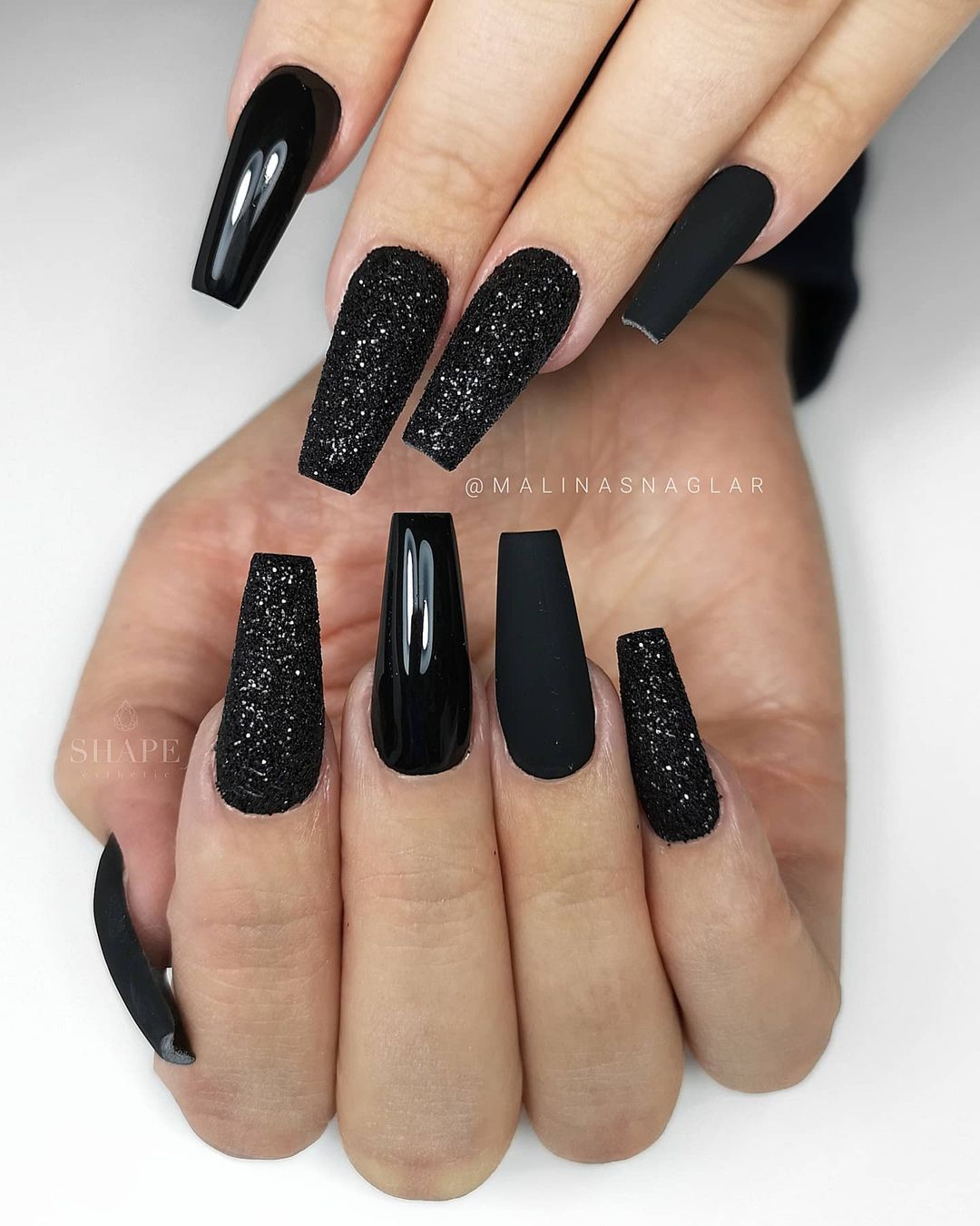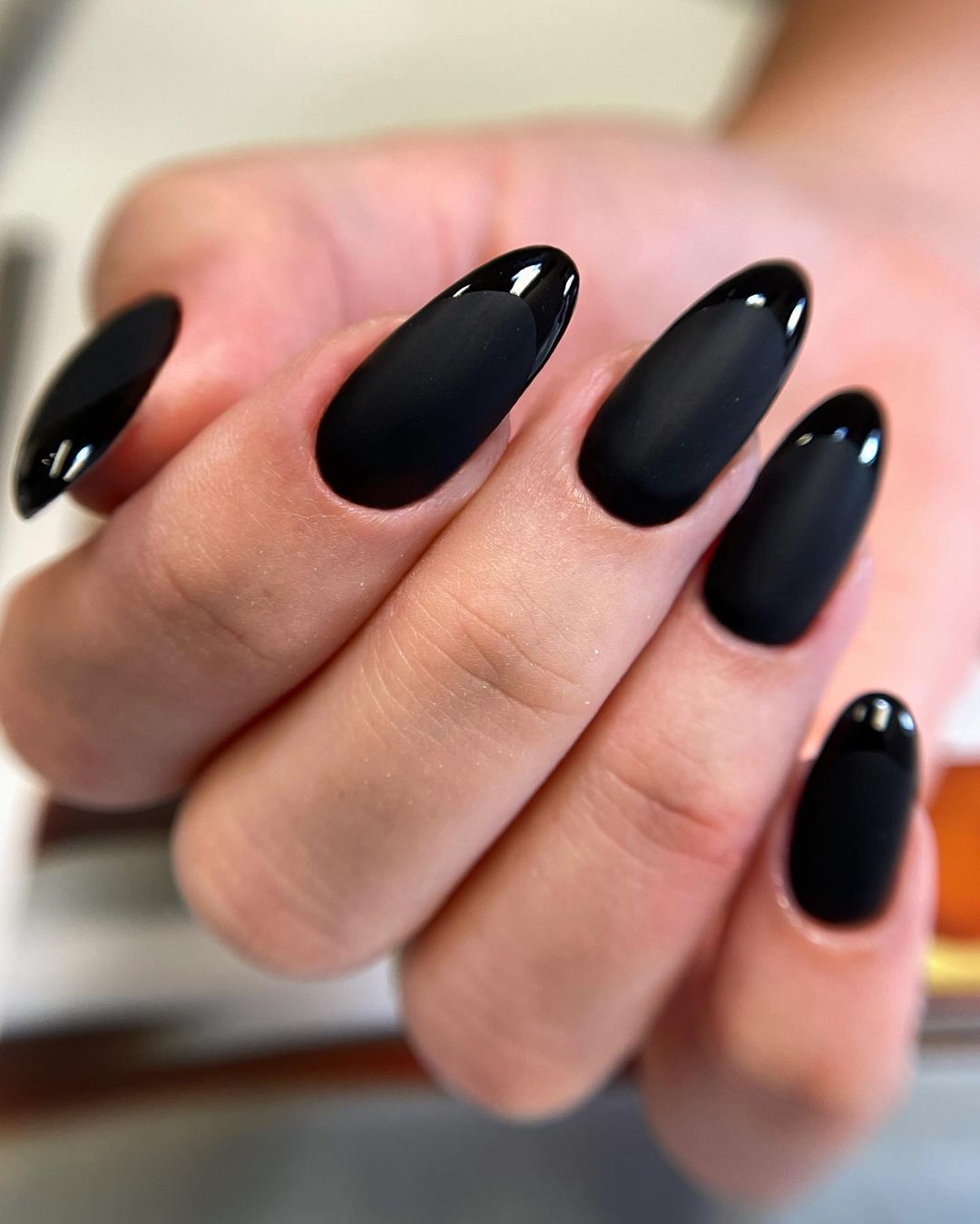 Вибір матового покриття замість глянсового може додати сучасний та вишуканий вигляд вашому чорному манікюру. Матові чорні нігті часто доповнюють глянцевими кінчиками, створюючи оригінальний варіант френча.