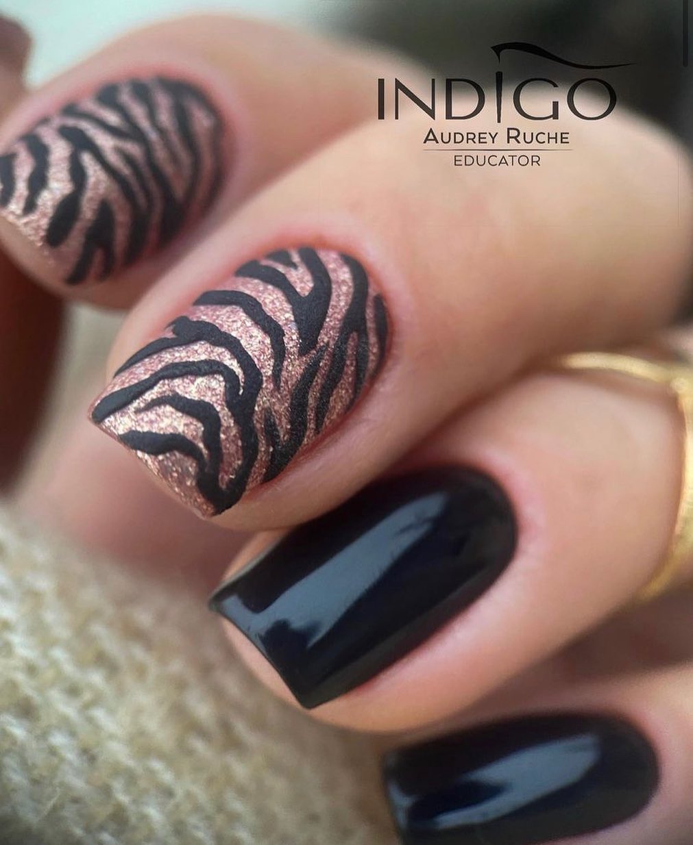 Спробуйте поєднати текстуровані покриття, такі як матові, глянсові або навіть оксамитові, щоб створити унікальний і тактильний чорний манікюр. Ці текстури можуть моментально виділити ваші нігті, а один із найбільш модних варіантів - текстурований тваринний принт.