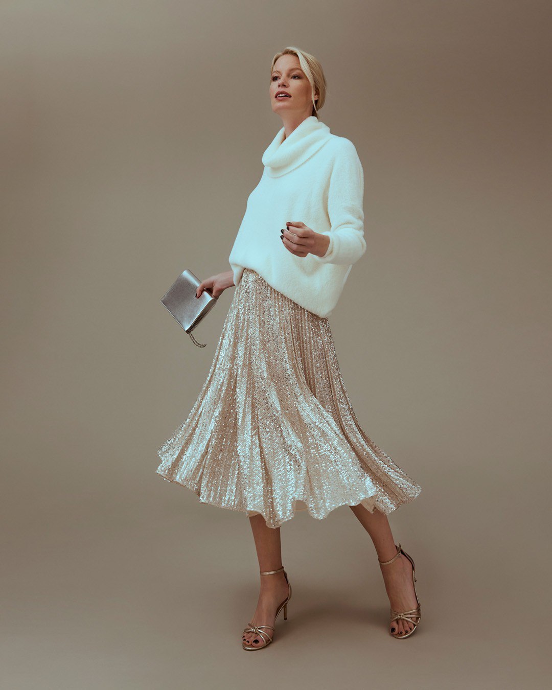 Блискучі сукні з паєтками та шовкові сукні-комбінації у 2023 році не виходять із моди, і якщо в приміщенні не надто тепло, сміливо поєднуйте їх з об'ємними светрами оверсайз. У Новий рік такий образ буде доречним та комфортним.