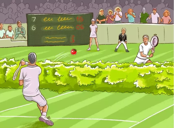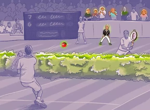 На картинці нижче показано переповнений зал під час гри в теніс, коли починається напружений плей-оф. Але що це? На зображенні є щось дивне, бо там досить багато помилок.
