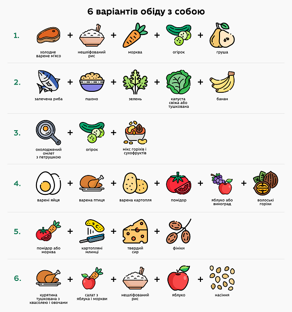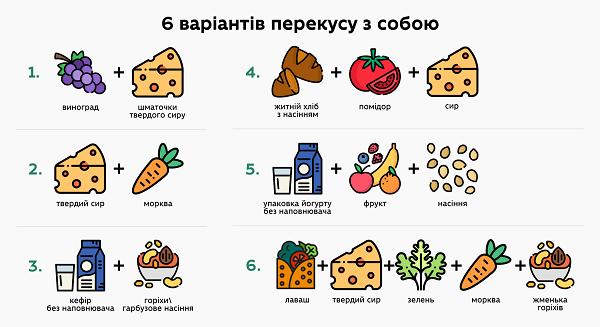 Експерти запропонували 6 варіантів повноцінних обідів та 12 варіантів перекусів, які дитина може взяти з собою до школи. Перекуси не замінять основний прийом їжі, але додадуть енергію та ситість до того часу, поки дитина не повернеться додому. Шість із них не містять продуктів, які швидко псуються, тому є хорошими варіантами, якщо дитина поїсть пізніше.