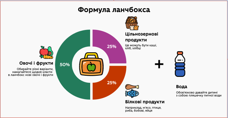 Головне правило: ланчбокс має максимально повторювати тарілку здорового харчування. Тобто, містити всі групи продуктів: овочі та фрукти, зернові та білкові продукти. Також треба подбати, щоб їжа була різнокольоровою та різноманітною.