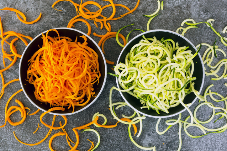 Часник очистіть та пропустіть через прес. Цибулю наріжте тонкими півкільцями. Моркву та кабачки натріть довгими смужками за допомогою терки для моркви по-корейськи.
