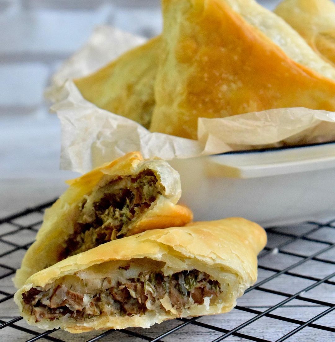 Перекладіть пиріжки на деко, застелене пергаментом. Випікайте при температурі 200 градусів приблизно 30 хвилин, поки пиріжки не набудуть рум'яної скоринки.