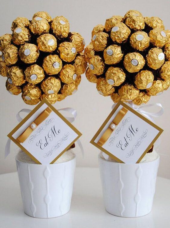 Ще один варіант поробки і подарунка на 8 березня - їстівний вазон. Для цього необхідно купити невеликий вазон і цукерки. Робимо круглу основу, на яку кріпимо солодощі в обгортці за допомогою клею. Прикріплюємо її на палицю - виходить своєрідна квітка з цукерок.