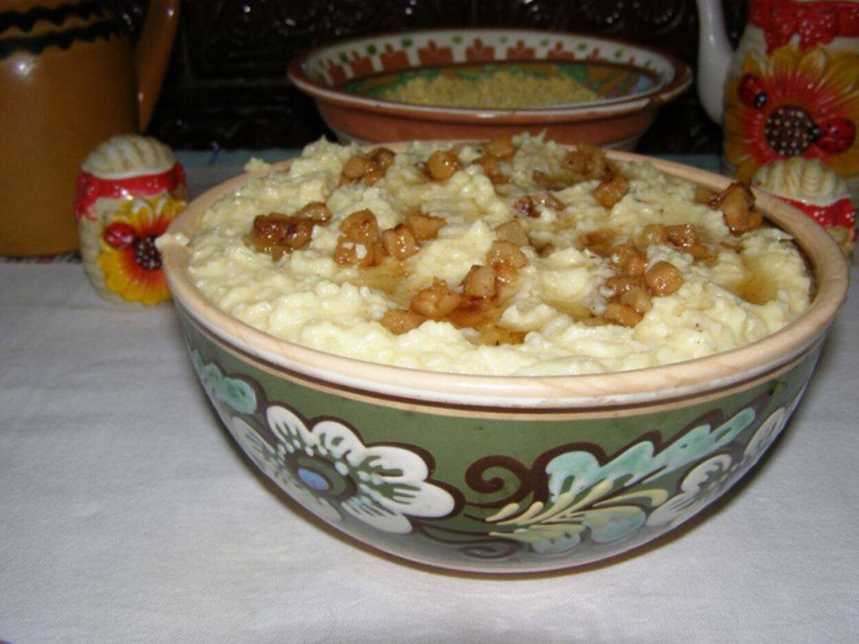Інгредієнти: квашена капуста (2 л), пшоно (300 г), цибуля (5-6 шт.), рослинна олія (100 мл), сметана (300-400 мл), підочеревина (300 г), сіль, перець.
