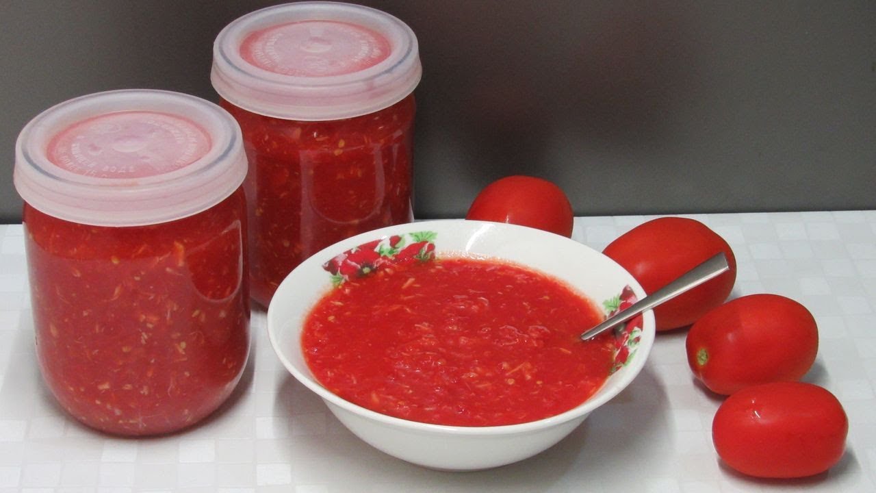 Інгредієнти: помідори (2 кг), болгарський перець (1 кг), гострий перець (1/2 стручка), часник (200 г), хрін (200 г), сіль (2 ст. л.), цукор (3 ст. л.), оцет 9% (1 ст. л.).