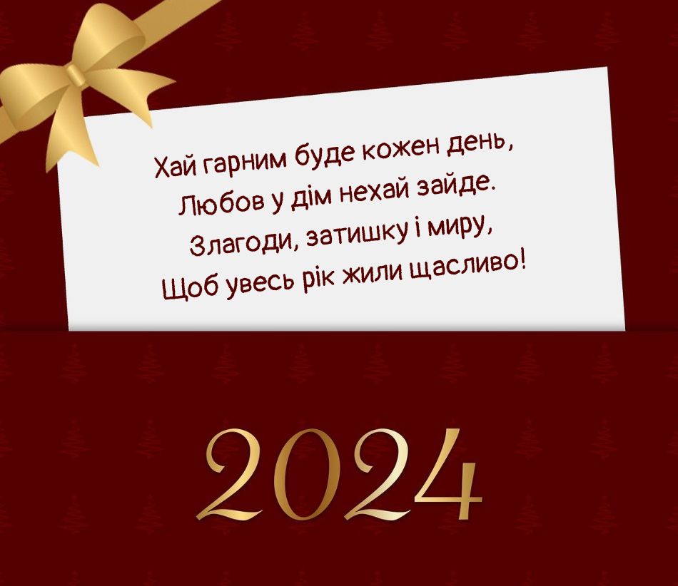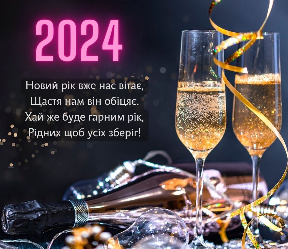 З Новим 2024 роком! Нехай він буде сповнений силою духу, міцним здоров'ям, любов'ю родини, радістю друзів, теплом і затишком рідного дому. Нехай дні будуть веселими та яскравими!
