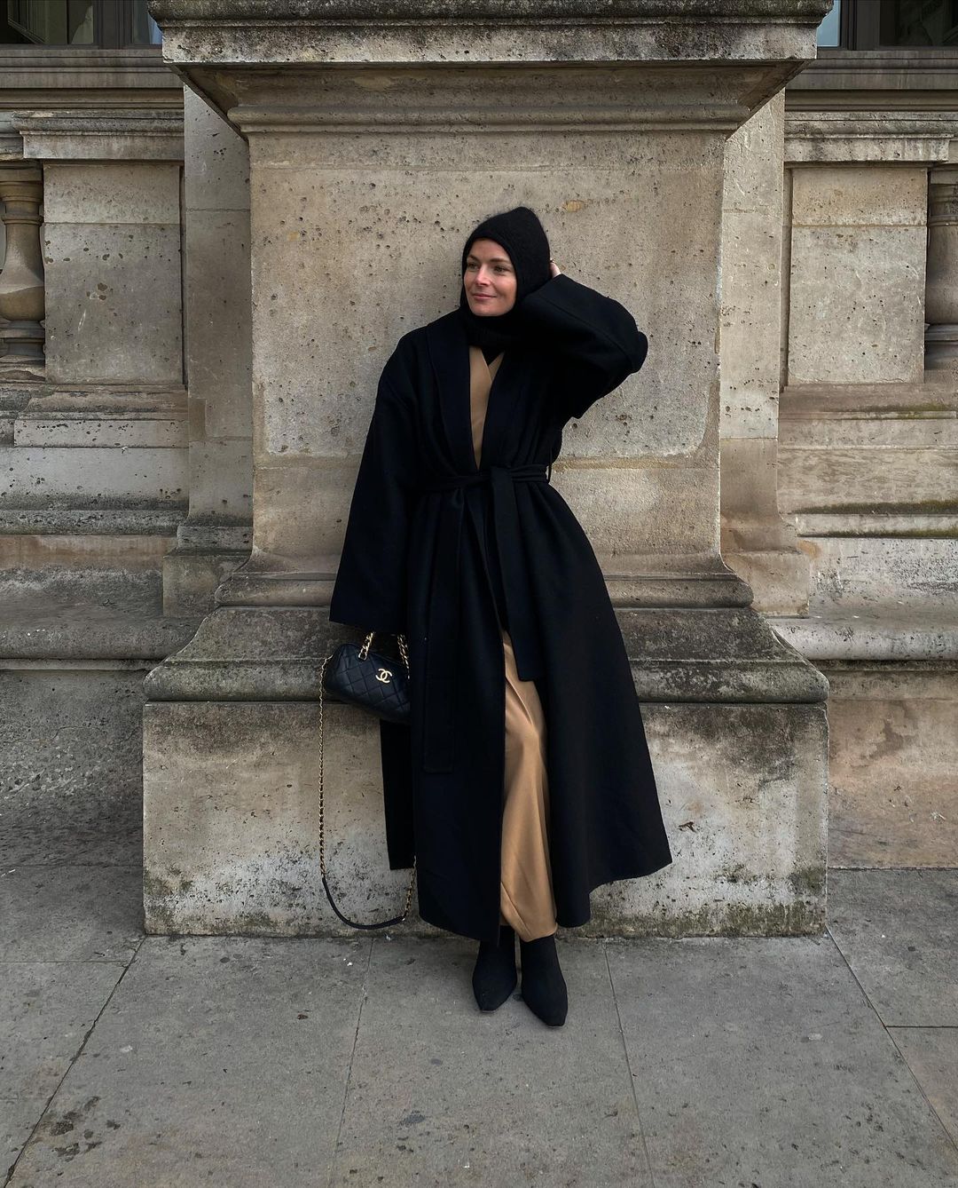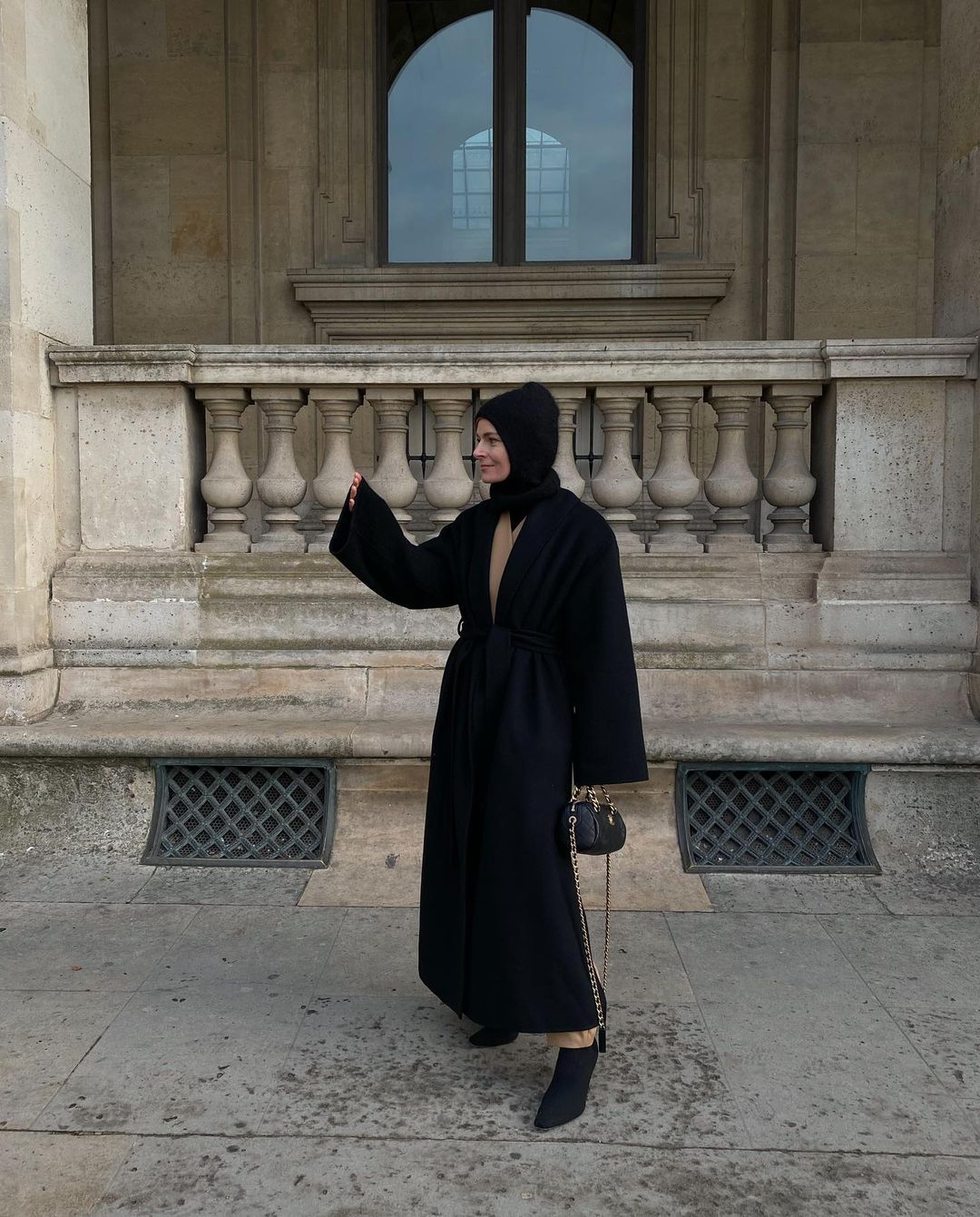 Ще один варіант стильного луку – чорний капор у поєднанні з чорним пальто.