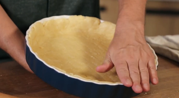 6. Охолоджене тісто розкачайте у вигляді основи для вашого кіша, викладіть у застелену пергаментом форму і проколіть виделкою по поверхні тіста.