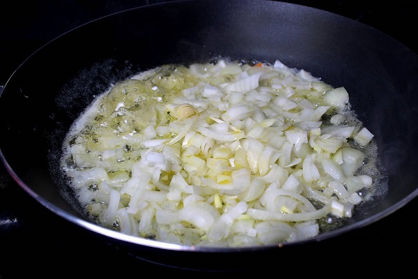 4. Для начинки ріпчасту цибулю розріжте на 4-6 частинок, залежно від розміру, або півкільцями. Обсмажте цибулю у розігрітій сковороді на олії час від часу перемішуючи, поки вона не стане м'яка і прозора (приблизно 20-30 хвилин).