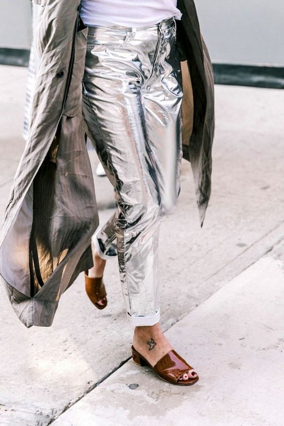 Сукні, спідниці та штани, що мають ефект металевого напилення – один з популярних трендів 2024 року, що прийшов до нас із минулого. Такі речі підійдуть як для повсякденних образів, так і для святкових, якщо їх доповнити взуттям на високих підборах та стильною сумкою.