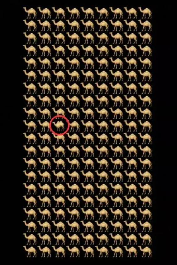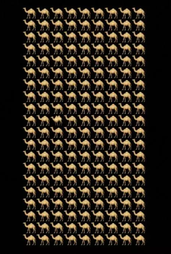 На зображенні головоломки показано верблюдів, вишикуваних у рядки та стовпці. Ваше завдання – лише за 11 секунд помітити дивного верблюда, який відрізняється від інших.