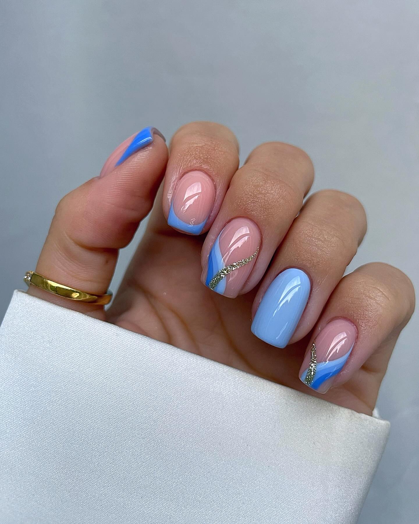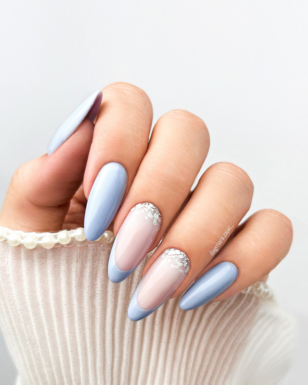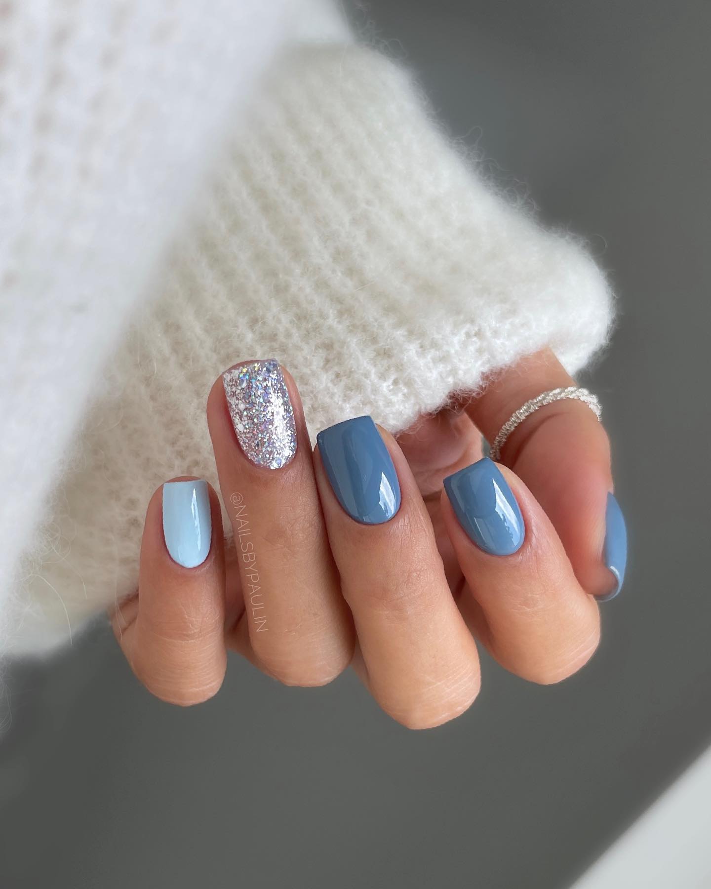 Також в одному манікюрі можна поєднати кілька відтінків блакитного, а також прикрасити один ніготь лаком із шиммерними блискітками.