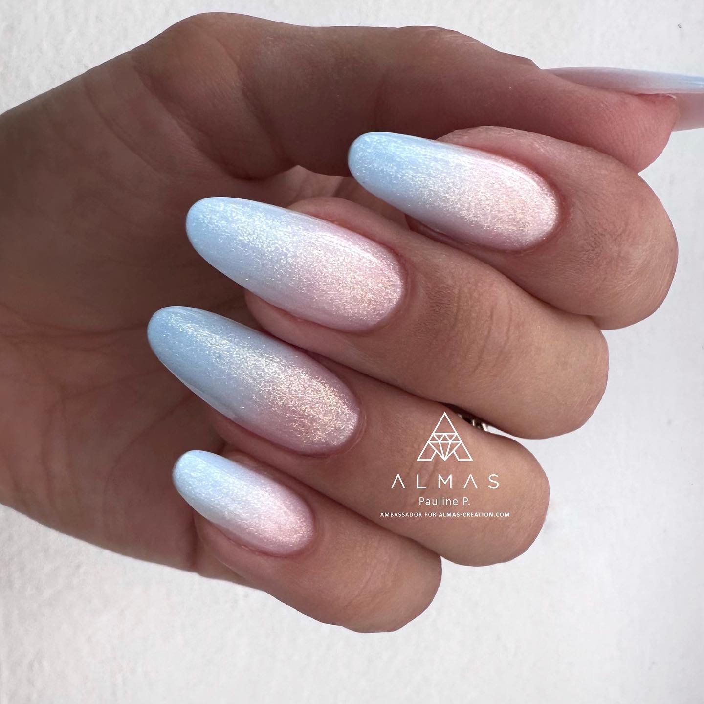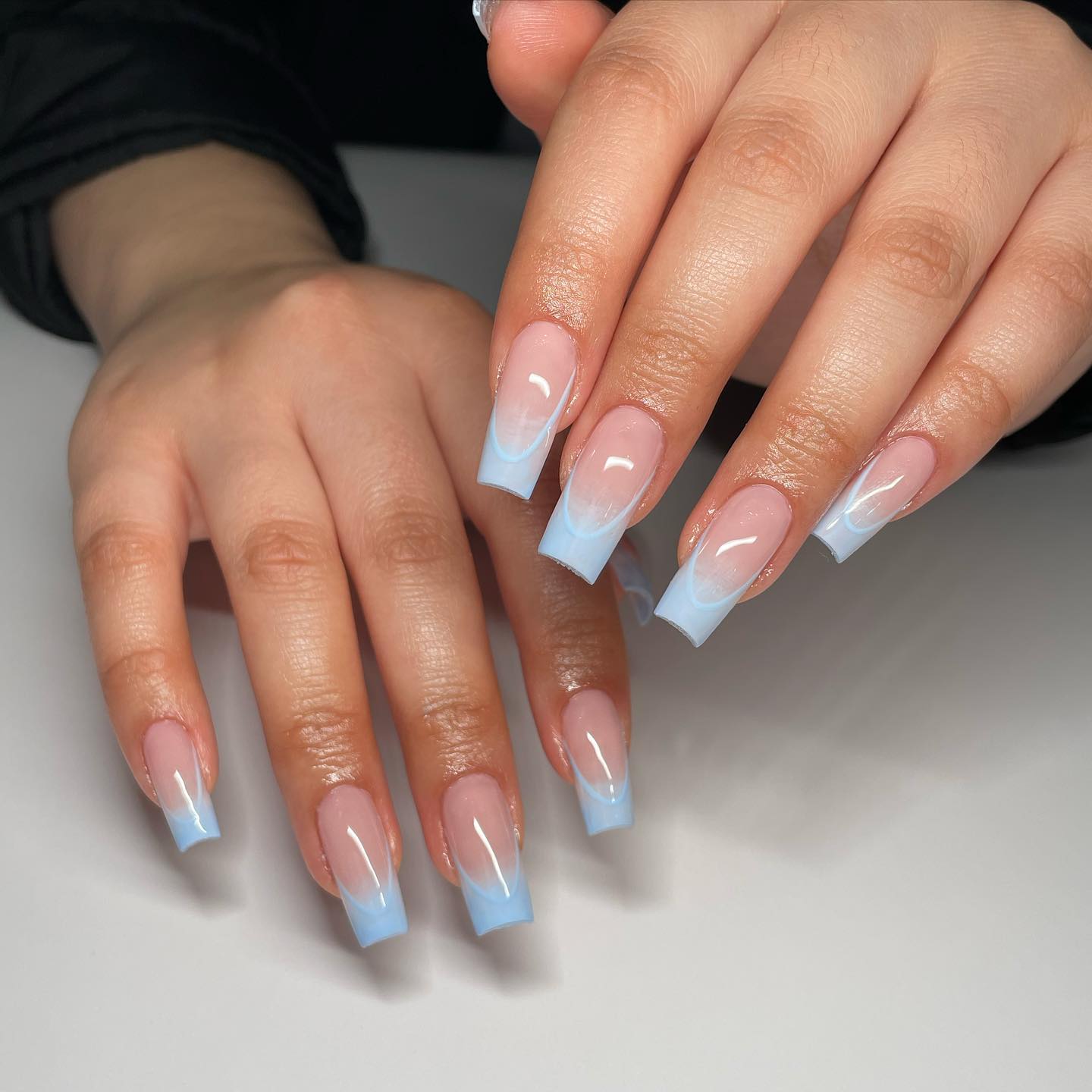 Також поекспериментуйте з нігтями омбре у блакитному відтінку. Манікюр омбре або, як його ще називають, градієнтний - це плавний перехід одного кольору в інший, межі між якими "розмивають".