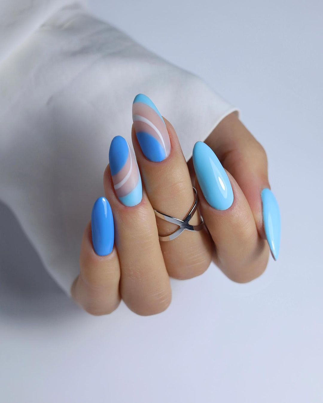 Блакитний манікюр вже називають одним із головних трендів майбутньої весни. Можна вибрати світлий відтінок гель-лаку, який нагадуватиме ясне небо чи морську блакитність. Доповніть такий дизайн хвилястими лініями більш насиченого кольору або геометричними фігурами в такій же кольоровій гамі.